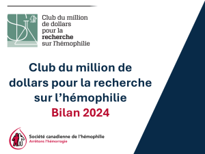 Depuis 1990, par le biais du programme de recherche de la SCH Le rêve d’une cure, le Club du million a investi près de trois millions de dollars dans une soixantaine de projets de recherche réalisés par plus de 50 chercheurs canadiens qui ont pour mission de trouver un remède définitif aux troubles héréditaires de la coagulation et d’améliorer les soins prodigués aux personnes qui en sont atteintes.